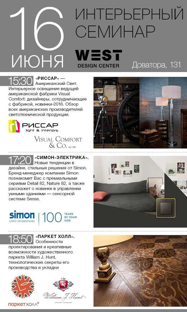 16 июня в Design Center West компании «Риссар» и «Паркет-Холл» провели совместный Интерьерный семинар — очередное мероприятие, укладывающееся в концепцию взаимодействия партнеров дизайн-центра и профессионального архитектурно-дизайнерского сообщества. В первой части своей презентации компания «Риссар» раскрыла собравшимся особенности американского подхода к освещению: лаконичность и кажущуюся простоту, но при этом — фантастическую респектабельность. Дизайнерам и архитекторам была представлена продукция фабрики Visual Comfort & Co — творения звезд американского дизайна Ральфа Лорена, Барбары Бэрри, Келли Уэстлер... Восторг? Мягко сказано, ведь собравшимся продемонстрировали как новинки фабрики, так и модели, ставшие мировыми бестселлерами — поистине уникальные изделия, в дизайне которых присутствуют настоящий пергамент, выдувное стекло, шелк, фарфор, винтажная латунь, античный никель, серебро… Вторая часть презентации была посвящена электроустановочным изделиям испанской компании Simon — в частности, премиальным сериям Detail 82 и Nature 82. К видимому удовольствию присутствующих, в зал были переданы рамки, выполненные из латуни, дерева, стекла, полированной стали, натурального сланца… Затронул представитель Simon в ЮФО Роман Ким и интересную новинку в управлении умными зданиями — сенсорную систему Sense. После чего перешел к особо приятному для собравшихся и объявил конкурс на лучший проект с использованием продукции Simon. Особая приятность заключалась в том, что первое место в конкурсе гарантирует… арт-поездку в Барселону с роскошной специализированной экскурсионной программой! Впрочем, возможность принять участие в конкурсе есть не только у присутствовавших на семинаре, но и у всех остальных дизайнеров и архитекторов — подробности его проведения можно узнать в салоне «Риссар». Вечерняя часть программы была отдана величественному союзу природной красоты и филигранного мастерства ремесленников — компания «Паркет-Холл» представила аудитории художественный паркет William J. Hunt. Говорить об этом бренде, пытаясь передать ощущения — невозможно. Ведь выпускаемый под этой маркой паркет вызывает довольно смешанные чувства: желание как можно тверже ступить на полированную гладь и одновременно парить над ней, не касаясь ее божественной красоты… Собравшимся были продемонстрированы особенности проектирования и креативные возможности этого художественного паркета, а также приоткрыты некоторые технологические секреты его производства и укладки… В завершение мероприятия все посетившие Интерьерный семинар искренне порадовались сочному летнему фуршету — тем более что сопровождало его выступление певицы Mirra Project, покорившей архитекторов и дизайнеров артистичным и чувственным вокалом.